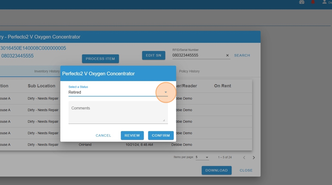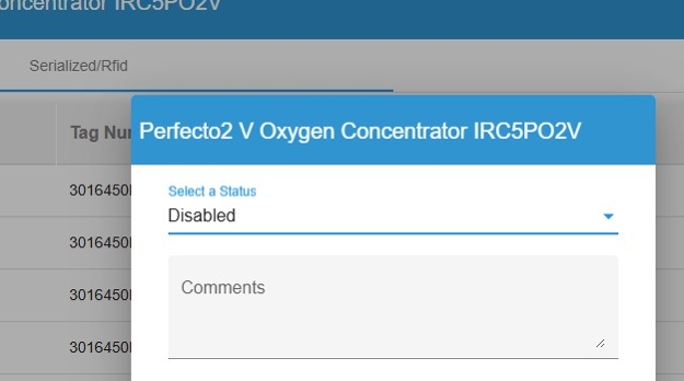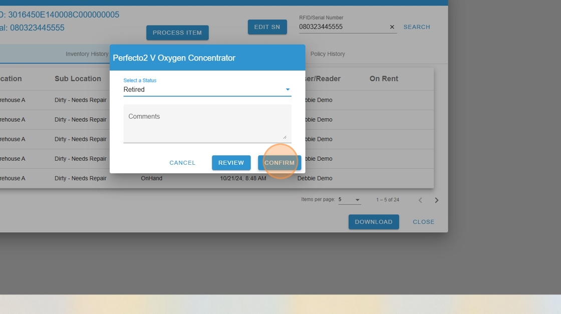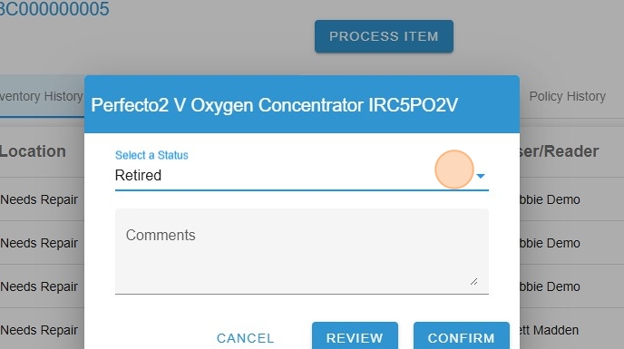 7. Enter notes (why a tag is disabled, retired reason, etc.) in the “Comments.” Then click “Review” to have it moved to the Admin Console for review/approval or “Confirm” to complete processing. If you are not a Supplier Admin or Location Manager, it will automatically move to the Admin Console for review.