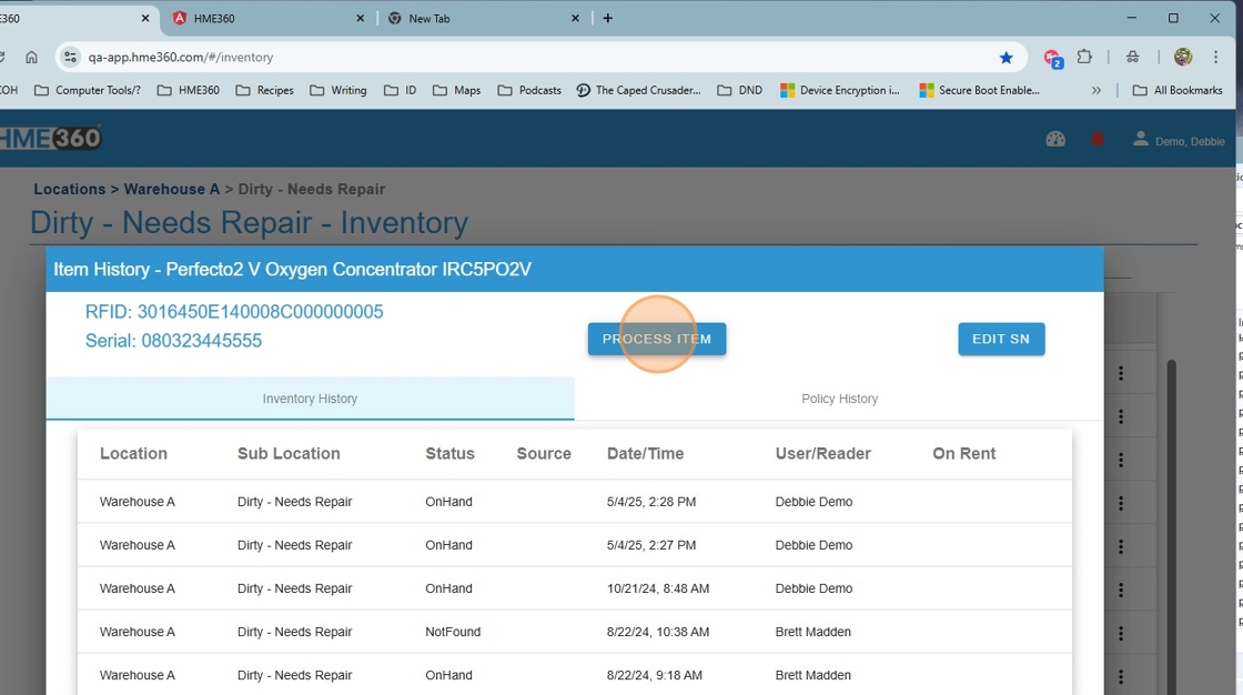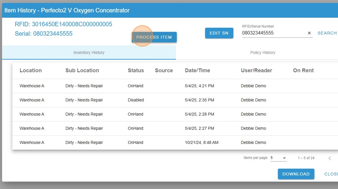 This workflow will allow you to change an item’s inventory status from the web in RFID/Serial History Search. Use this flow to correct previously retired or disabled tagged items. Choose from the following Statuses: Retired, Disabled, Dispensed, or Onhand.