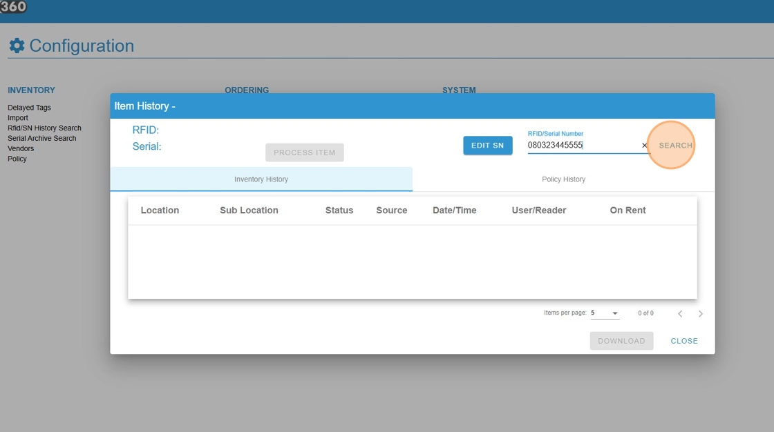 3. In RFID/Serial Number field, paste or type the RFID/Serial Number. Click “SEARCH”
