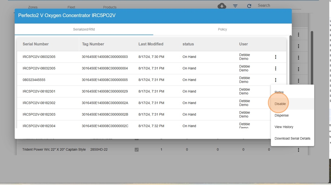 4. In the pop-up menu, select Retire, Disable, or Dispense. You may instead choose View History to change the status (Go to Step 6).