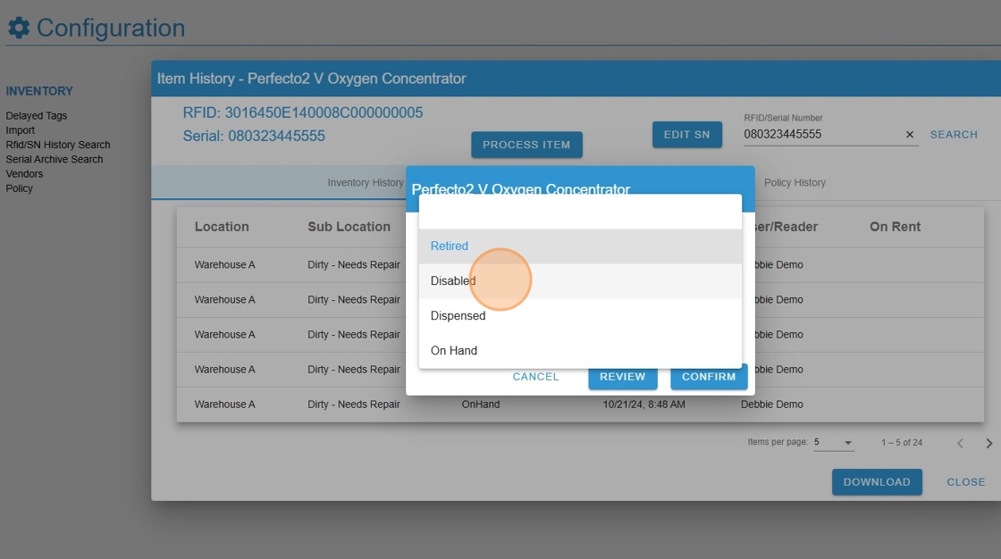 This workflow will allow you to change an item’s inventory status from the web inventory location view. Serialized and/or RFID-tagged items on hand or exited may be changed. Choose from the following Statuses: Retired, Disabled, or Dispensed.